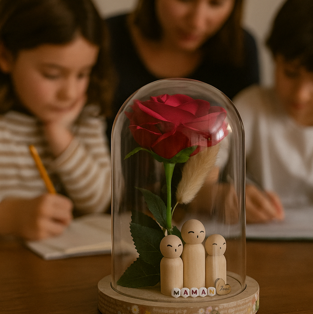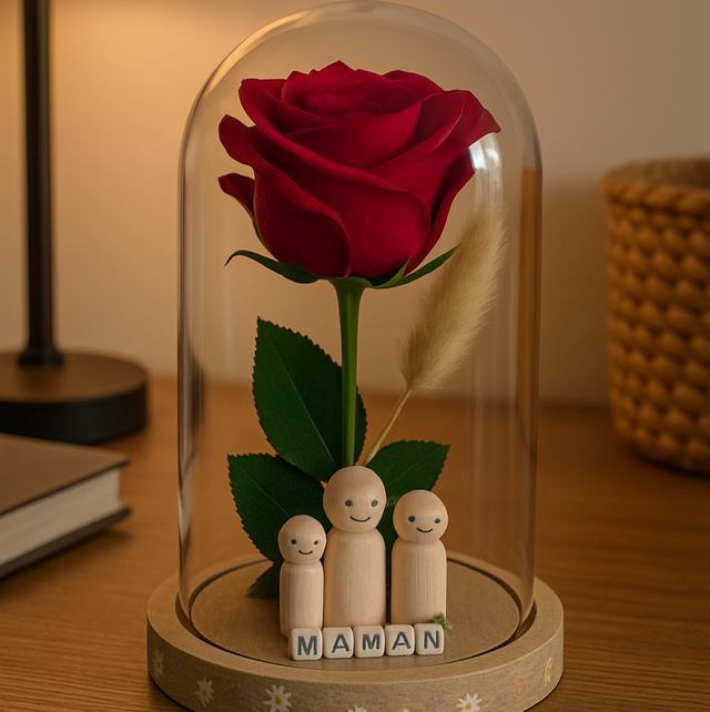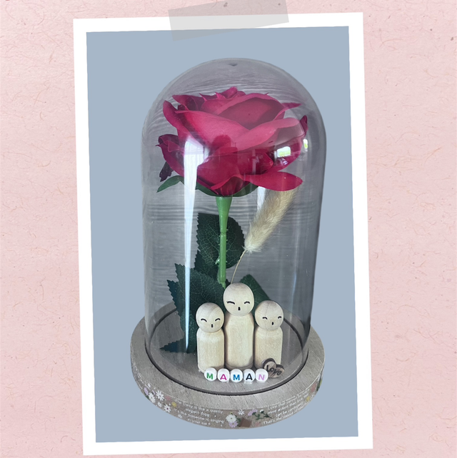 Sous cette élégante cloche au couvercle en plastique et au socle en bois se cache un petit trésor : une rose éternelle accompagnée de 3 adorables personnages en bois, personnalisables selon votre histoire. Que ce soit pour la fête des mères, un anniversaire, Noël ou simplement pour dire “je t’aime”, cette création est parfaite pour faire chavirer le cœur d’une maman ou d’une mamie.
